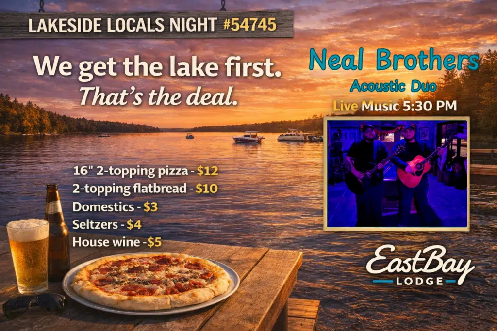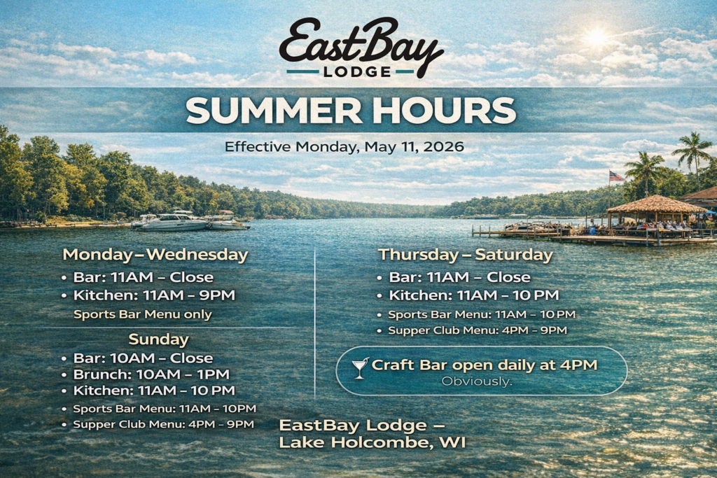 Whether you’re here for live music, themed parties, sports nights, or lakeside lounging, Eastbay Lodge has something for everyone, every day.