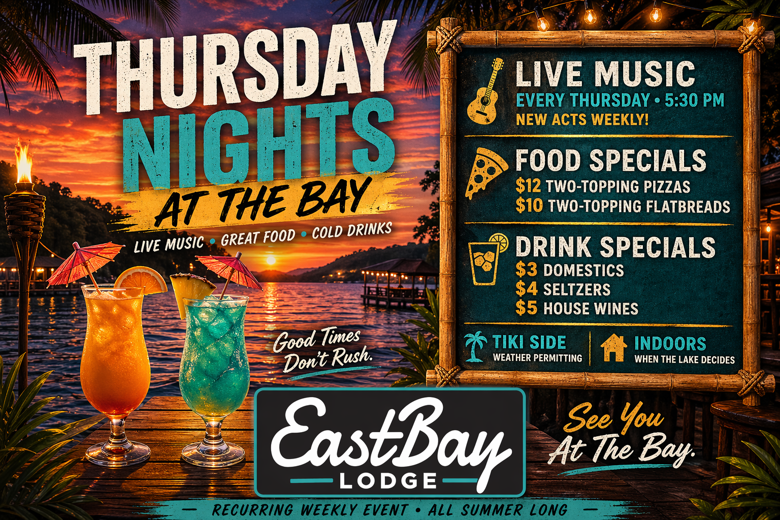 Whether you’re here for live music, themed parties, sports nights, or lakeside lounging, Eastbay Lodge has something for everyone, every day.